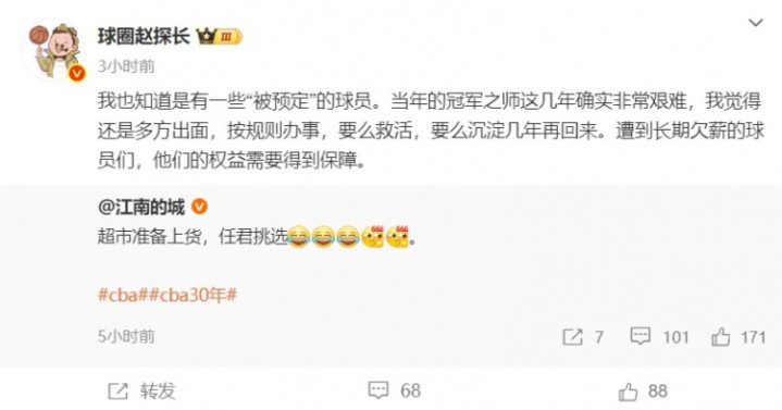 @球圈赵探长在社媒上转发了这条动态,并在旁边写道:“我也知道是有一些‘被预定’的球员。当年的冠军之师这几年确实非常艰难,我觉得还是多方出面,按规则办事,要么救活,要么沉淀几年再回来。遭到长期欠薪的球员们,他们的权益需要得到保障。”