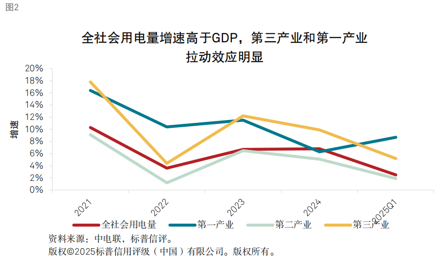“十四五”以来,我国全社会用电量基本保持高于国内生产总值(GDP)的增长速率,2021-2024复合年均增长7.0%。其中,第三产业和第一产业对全社会用电量增长的拉动作用明显,这主要得益于我国在用电需求高的电动汽车、人工智能、大数据、5G等新兴领域的快速发展,以及大规模农网改造和行业电气化水平的提升。第二产业中,虽然部分传统工业用电需求有所不振,但高技术及装备制造业等我国重点发展行业也保持着较强的用电需求。