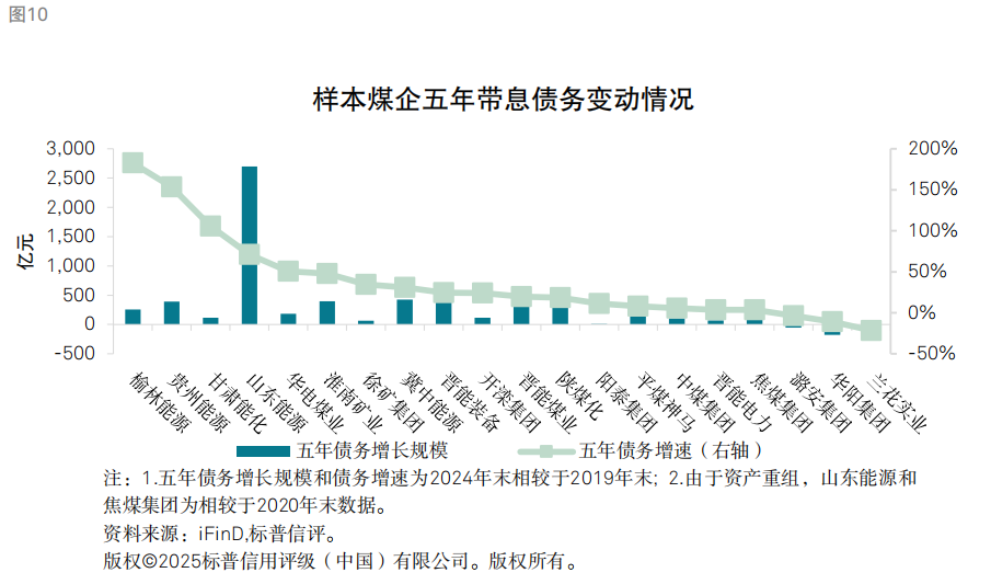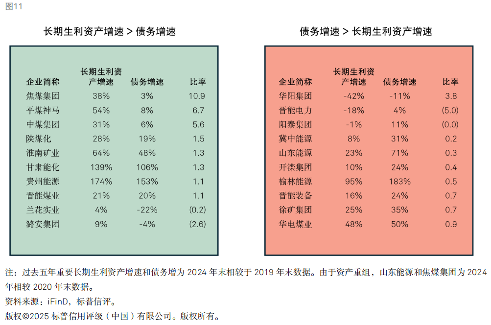 样本煤企债务的变化对重要长期生利资产增长的贡献效率存在较明显差异。焦煤集团、平煤神马、中煤集团等,过去五年长期生利资产增速大于债务增速,资产债务结构有所改善;而华阳集团、晋能电力、阳泰集团、冀中能源(维权)等债务增速明显高于长期生利资产增速。