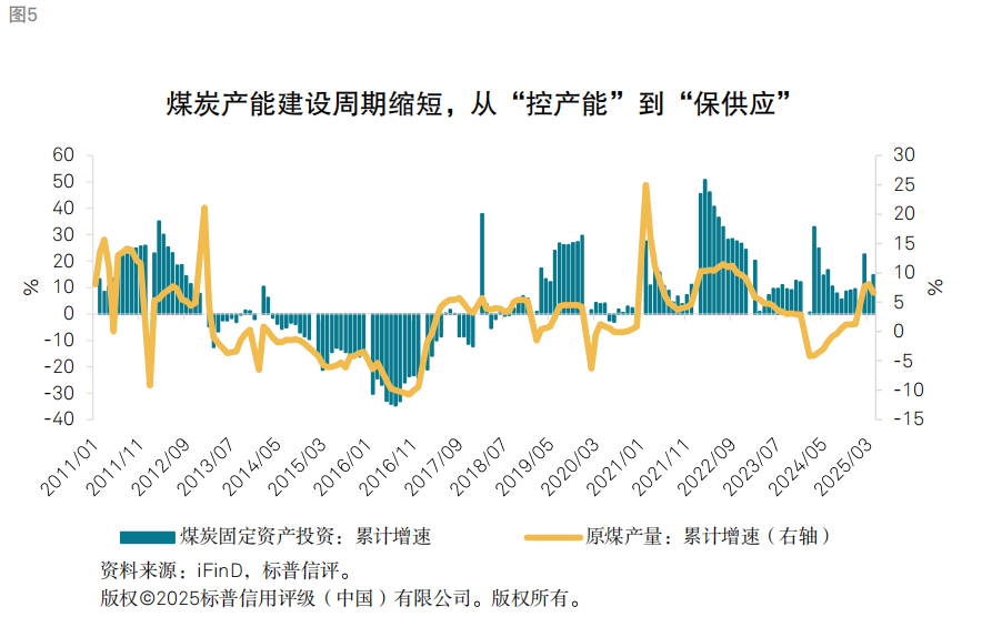我们认为,虽然煤炭供需紧张格局已得到明显缓解,但未来一段时间政策端仍将建立在“保供”基础之上,短期较难见到转向,2025年国内煤炭产量小幅增长,行业供给保持相对宽松。我们观察到,近年来,政策导向和技术进步明显缩短了煤炭投资到实现生产的传导周期,这一变化反映了煤炭行业从“控产能”到“保供应”的战略转型,以及产能建设效率的实质性提升。供给侧改革后时期,国家对煤炭新增产能限制严格,固定资产投资较多用于现有矿井环保改造和技术升级,新建产能新增速率较慢,投资转化为产量的链条较长。在经历2021年能源短缺后,国家加速新矿井审批和产能释放,叠加技术进步,产能建设周期已缩短至1-1.5年。这样的趋势变化使得煤炭供应从2021年的紧张状况逐步转变向宽松。但我们认为,现阶段煤炭对于全国能源保供依然具有很高重要性。一方面,能源供应的稳定性对于民生保障至关重要,另一方面,我国各项先进制造业、新兴产业等发展处于关键时期,需要能源提供保障和支持。因此,我们或难以在短期内见到政策端新一轮的供给侧改革措施。