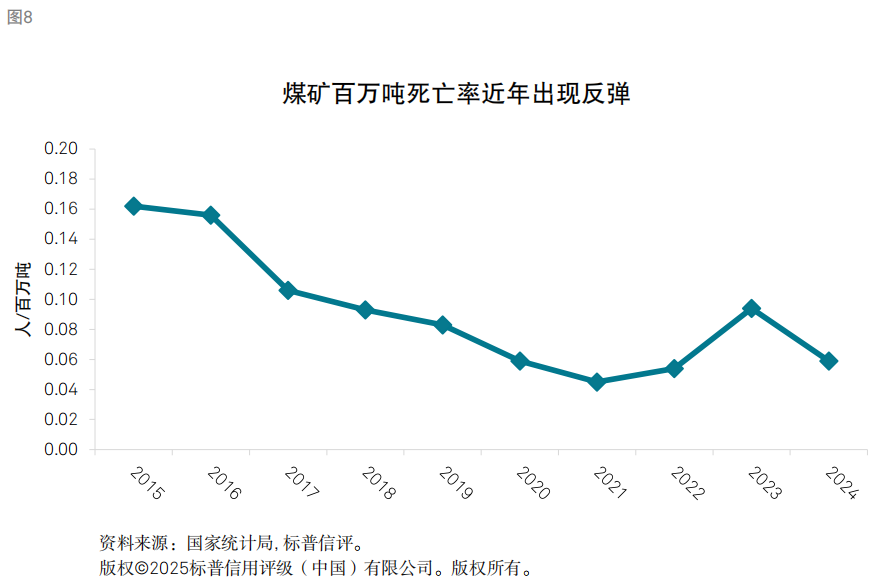 我们认为,安监将持续构成煤炭供给的一个边际制约因素。保供需求增加使得近年来产煤主力省份增产力度均较大,对煤矿安全生产形成较大的挑战。随着生产技术和智能化水平的提升,我国煤矿百万吨死亡率整体呈现下降趋势,但于2022年出现回升,2023年明显反弹至0.094人/百万吨。山西省在2024年上半年大力增强安监治理力度,当年煤炭产量在“三超”治理下减量明显。我们认为,随着煤矿开采程度的加深,尤其对于一些东部、中部省份以及山西、陕西南部等矿龄较长的煤矿来讲,安全生产压力将会持续存在。
