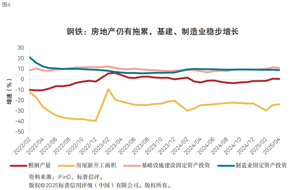 我们认为,钢铁作为重要地产相关产业链在房地产行业调整过程中也在寻求新的平衡点,短期影响用煤需求。钢铁主要对应焦煤需求,受到地产行业深度调整等因素的影响,近年来国内钢铁需求持续下滑,全国粗钢产量整体呈现波动收缩状态。我们认为,政策持续加码推动楼市“止跌回稳”对稳定钢材需求具有积极意义,但政策从销售端传导至建设端的链条和周期较长,短期或仍难抑制钢铁内需下滑趋势。我们观察到,2025年3月小阳春之后, 房地产行业销售、投资等数据有所疲软,行业企稳仍面临压力。2025年1-5月,商品房销售额和销售面积累计同比分别下降3.8%和2.9%,房地产建筑工程和新开工面积仍延续较大跌幅,分别为-12.6%(1-4月)和-22.8%。