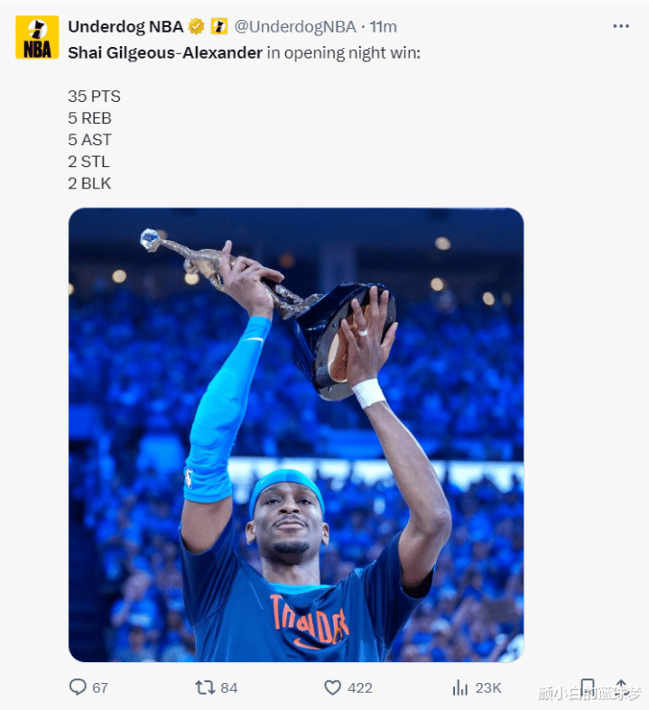 SGA在下半场才发威,第三节6分,末节5中4拿到12分3篮板1助攻1抢断,他上半场只有5分,是他末节的表现帮助雷霆拖入加时赛。进入加时赛切特命中三分,随后亚历山大又命中三分,雷霆领先到6分,SGA中投继续有,切特再中三分,申京传球被SGA断掉,SGA绝杀未能命中。