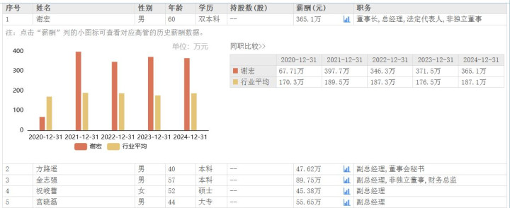 此外值得一提的是,谢宏去年薪酬为365.1万元,相较于2023年的371.5万元,下降了6.4万元,但其仍为公司高管中唯一薪酬超百万的,其他高管成员薪酬大多都在40至90万元左右,可见谢宏薪酬在公司为断层领先状态。