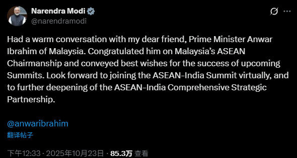 莫迪在X发文称:“期待以线上方式参加东盟峰会,并进一步深化东盟-印度全面战略伙伴关系。”